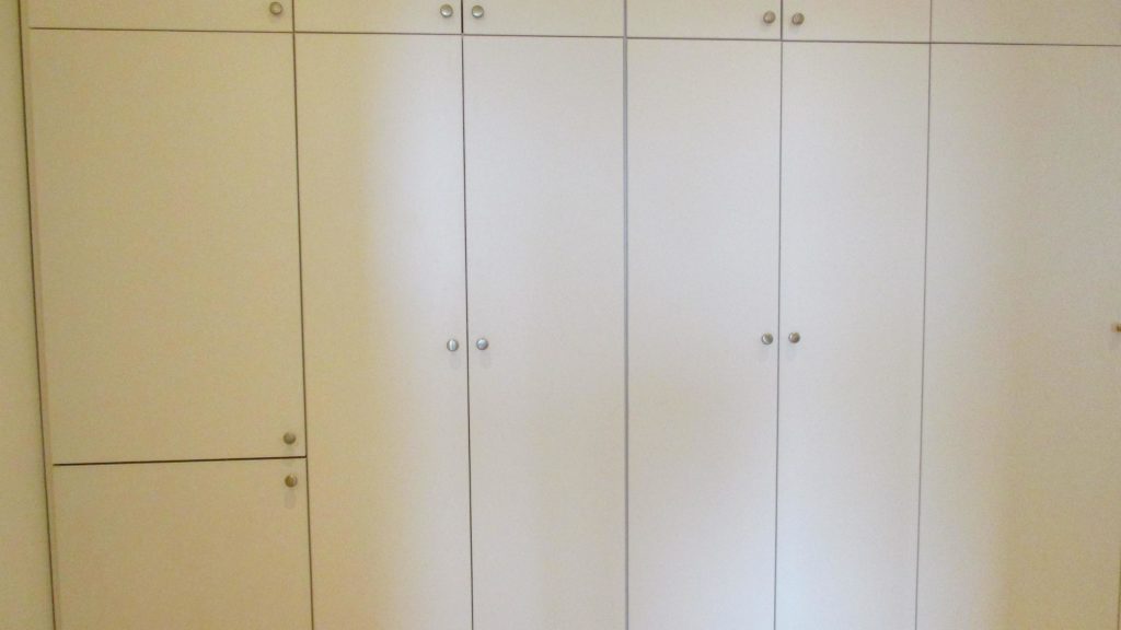 Pour ce projet, il fallait créer un ensemble de placards sur une grande longueur. Afin de les rendre le plus discret possible, le choix s’est porté sur des portes en mélaminé blanc (couleur de l’appartement) avec des boutons de porte en acier brossé.